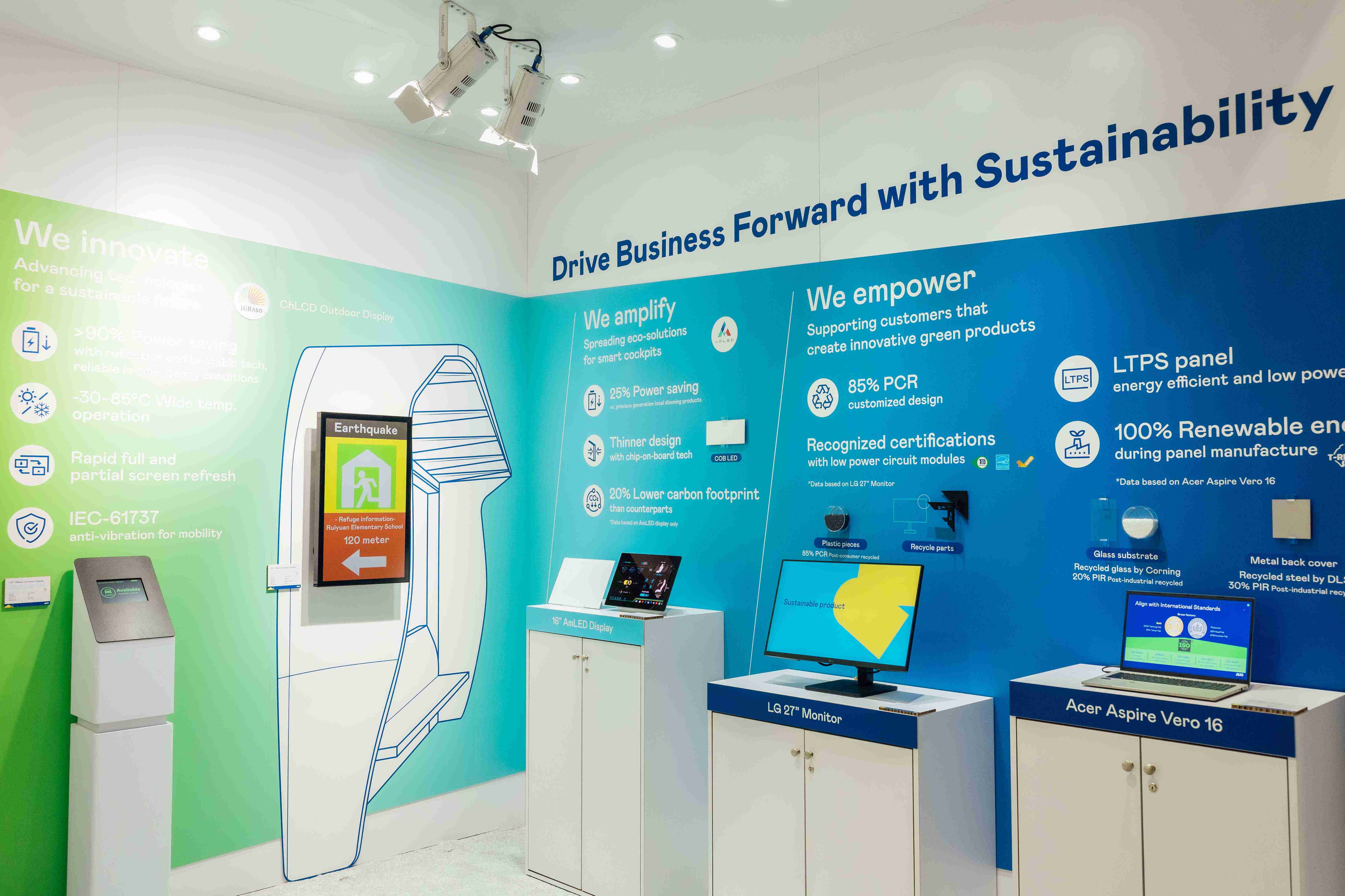 汇旺支付运用创新显示技术HiRaso胆固醇液晶双稳态技术达到显示零耗能、、扩大节能省电的AmLED显示技术应用于车用产品、、以再生的消费后回收(PCR)塑料及全绿电生产之面板,,,,应用于笔电及萤幕,,,增加绿色价值。。