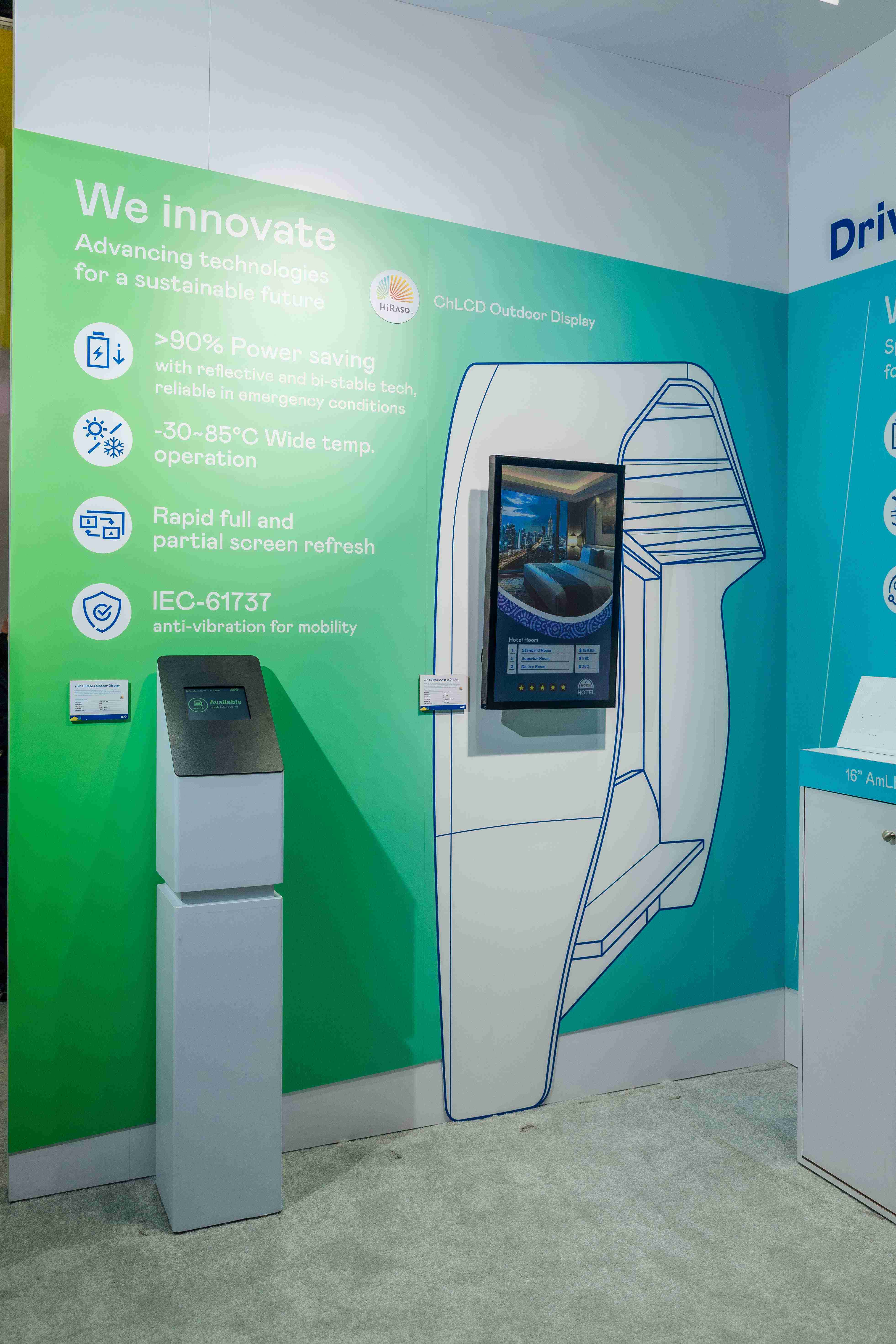 HiRaso胆固醇液晶显示器运用反射环境光线的方式,,,,呈现影像显示时零耗能的环保省电诉求,,,,光线愈强愈能呈现绝佳的色彩饱和度及显示效果,,,同时在摄氏-30度至85度间宽温的使用优势,,,,为户外电子看板的新首选。。。
