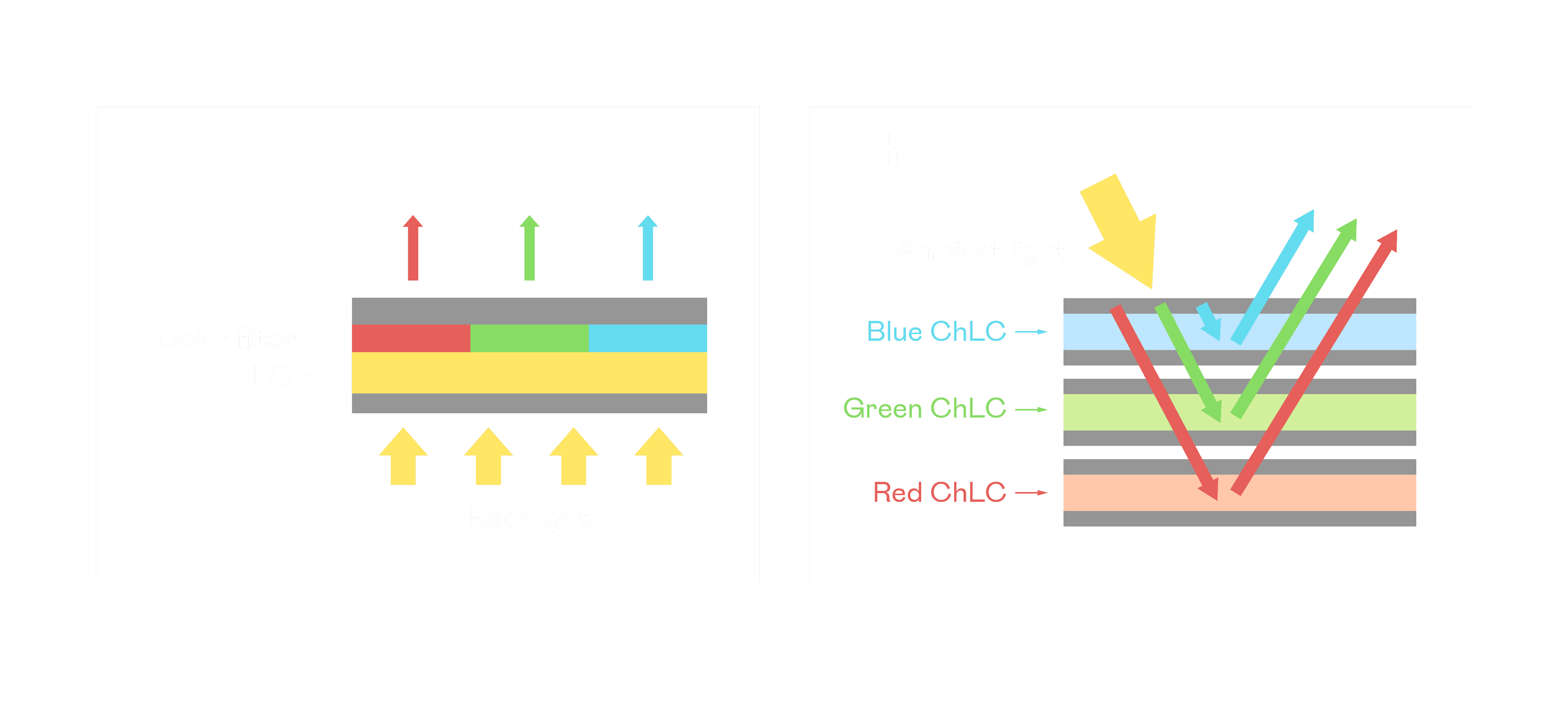 ChLCD 胆固醇液晶就如同纸张一样,,透过反射环境光来显示影像,,,,因此长时间观看不易造成人眼视觉疲劳,,,,可达到护眼效果。。。当处于户外阳光下使用,,,LCD 影像容易失真而不易观看,,,,但胆固醇液晶仍可维持较佳的影像品质。。。
