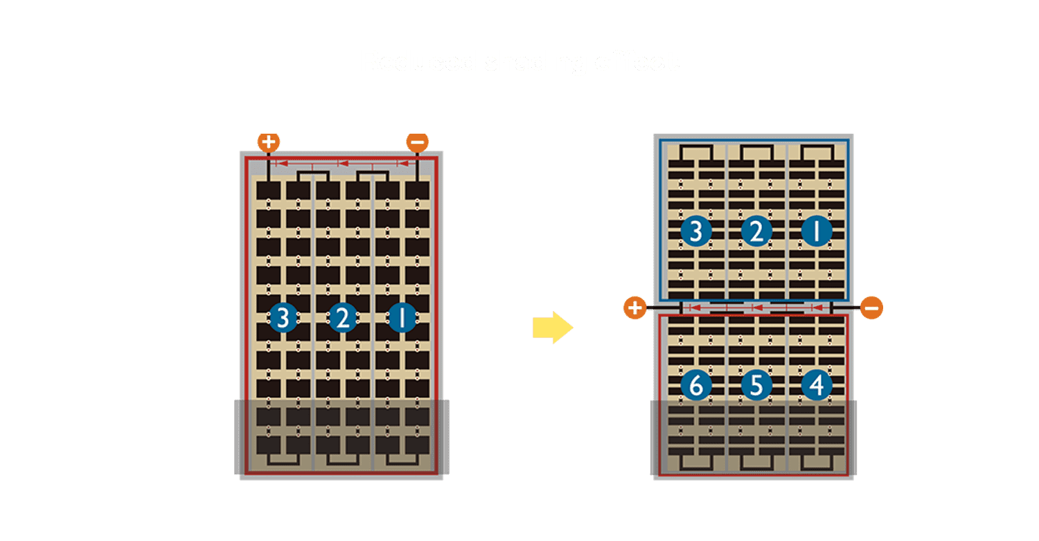 • 电池使用多条铜导线 (Copper wire) 于电池片上形成较短的电流路径,,,提高电流收集效率,,采用圆形设计的铜导线较传统扁平式的铜焊带 (Ribbon),,,可增加入射至电池的光线量。。。