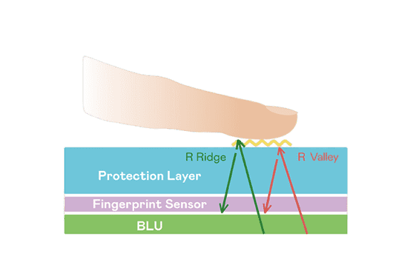 TFT 指纹扫描感测技术利用薄膜电晶体 (TFT) 当作光感测元件,,,,藉由非晶硅 (a-Si) 与低温多晶硅(LTPS)既有光电转换特性对不同波段光源进行吸收,,,使感测 IC 读取阵列感测元件的光漏电差异,,,转换成数位灰阶影像。。。。